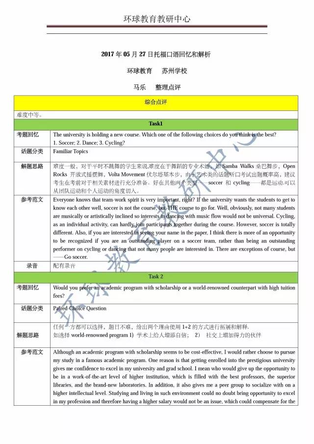 本次考试回忆为大家带来2017年5月27日托福口语考试内容及答案!本次托福口语考试独立口语难度中等。