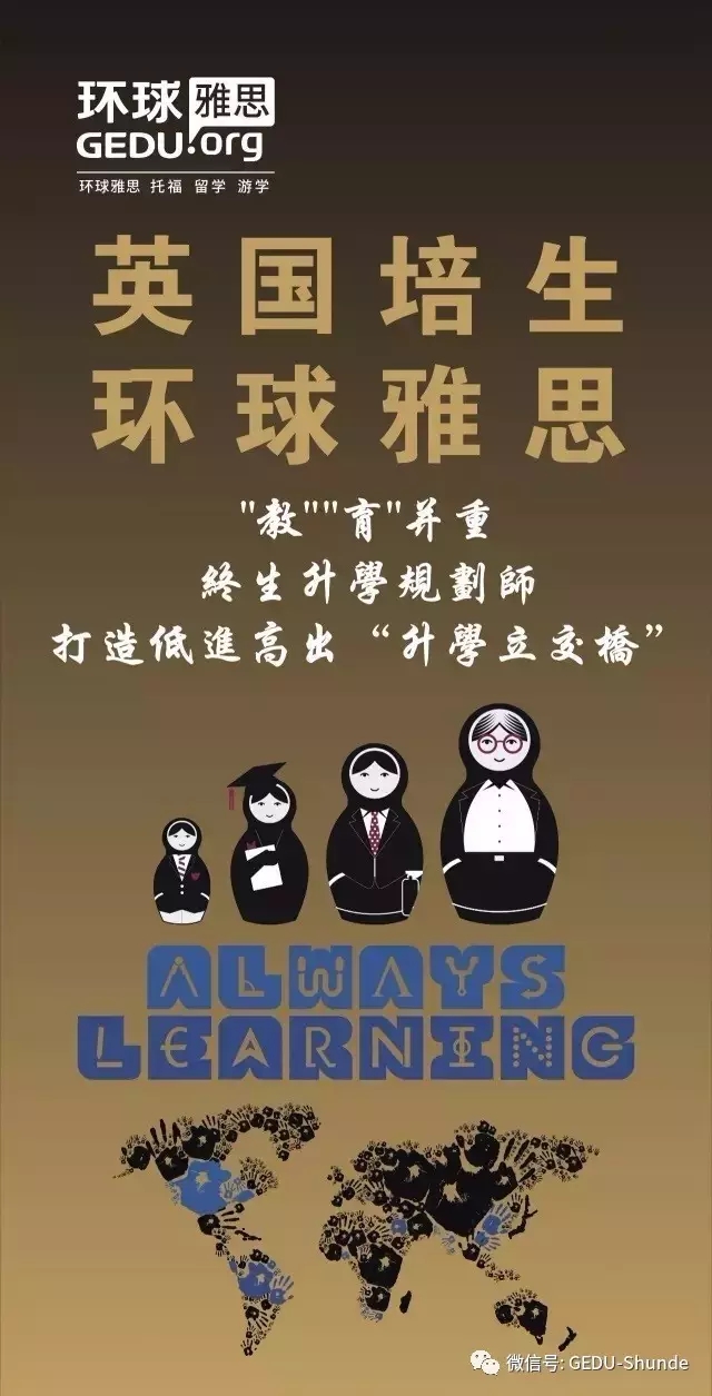 秉承英国培生的全球教育理念,顺德环球教育立志于为顺德各种学生打造“低进高出升学立交桥”,提供优质的适合其发展的教育资源和针对性升学方案。